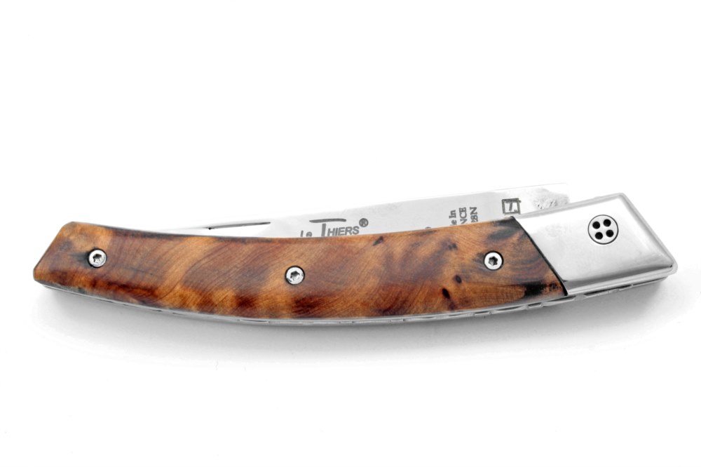 Diese schwere und kompakte Modell liegt gut in der Hand und überzeugt durch die raffinierte Technik. Die Klinge ist kugelgelagert und kann mittels dem mitgelieferten Schlüssel in Ihrer Gängigkeit reguliert werden. Durch den ausgestanzten Schlitz in der Klinge, lässt es sich leicht öffnen. Made in France. Messerlänge gefaltet: 12,5 cm Ausgeklappt: 21,5 cm Klingenlänge: 10 cm Stahl: Schwedischer Sandvik 14C28N. Gewicht: 145 Gramm Griffschalen: Thuja. Mit Torx Schrauben befestigt. Feder von Hand ziseliert.