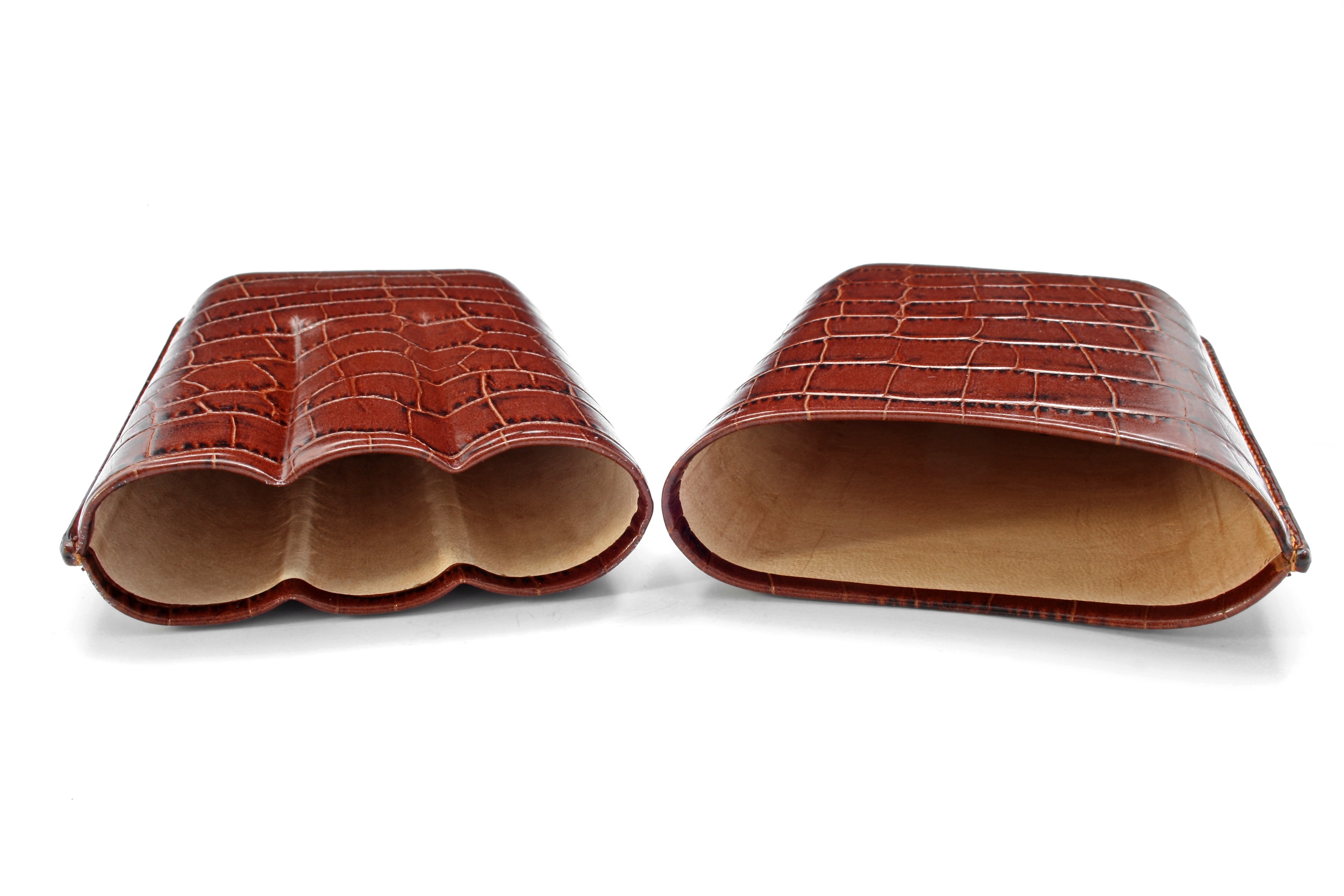 Unsere Bestsellerserie aus Rindsleder ist sowohl in glatt als auch in einer Vielzahl eleganter Prägungen erhältlich. Die Etuis sind variabel, mit hauchdünnem Ziegenleder ausgeschlagen, dessen Geruch sich wunderbar mit dem der Zigarre vermählt. Die Naht des Etuis ist dünn und elegant. Sie verläuft lediglich um das halbe Etui und ist damit besonders aufwendig. Die Etuis sind Zeugnis größter Sattlerkunst.