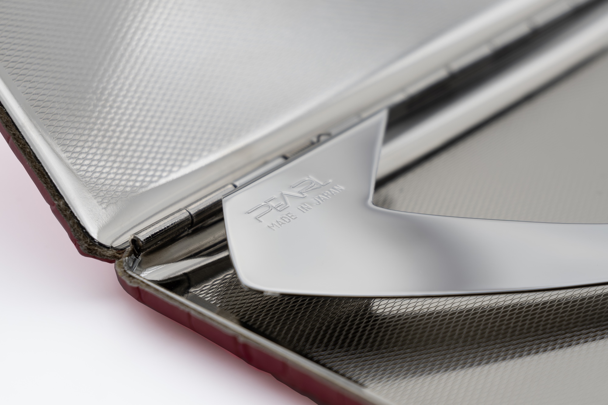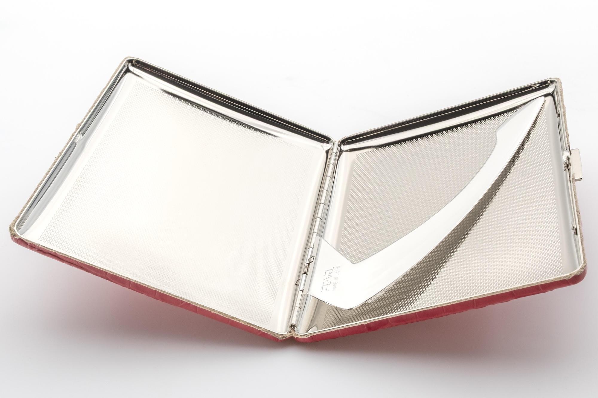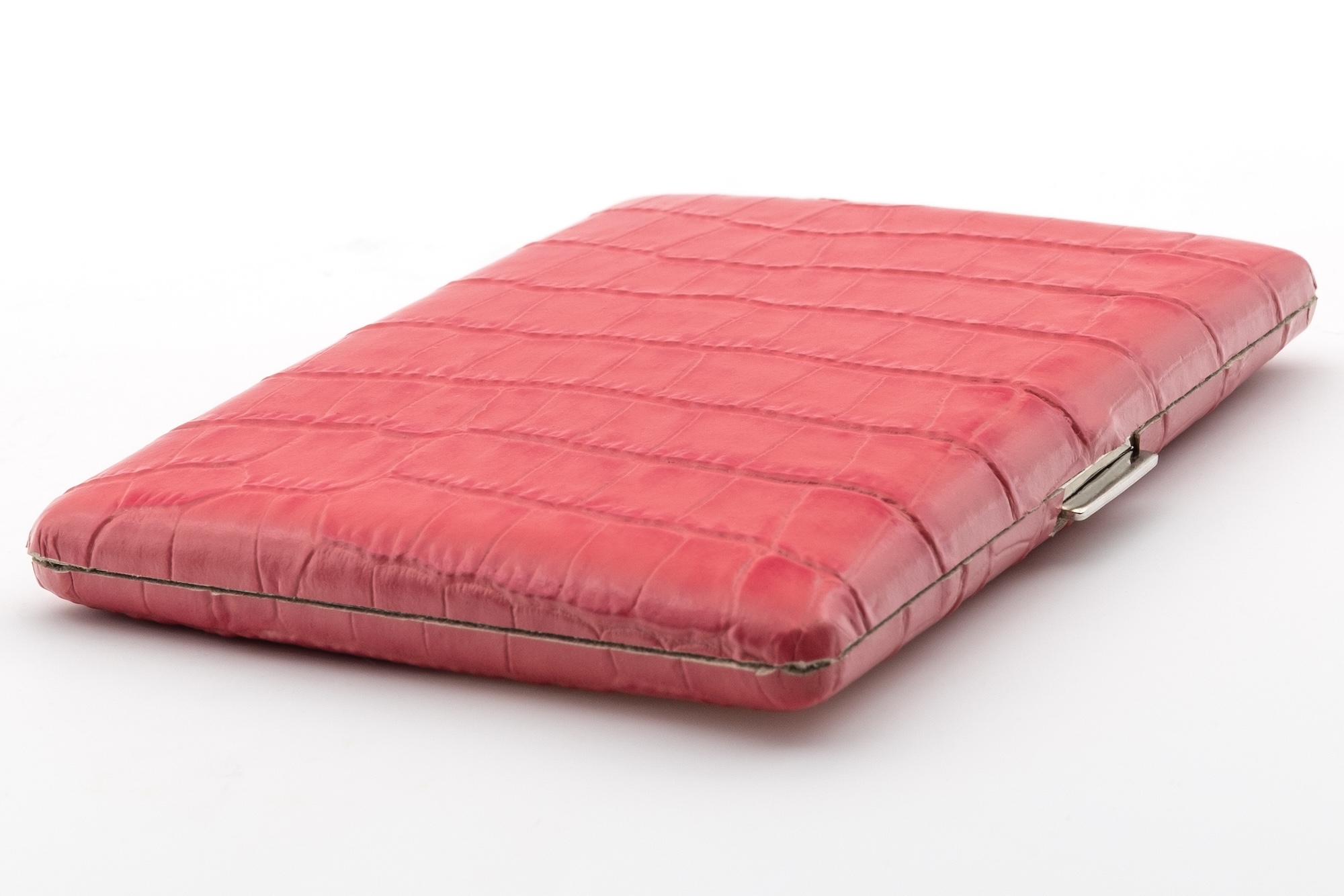 Für 9 Zigaretten von Normalgröße bis 100 mm. Mit pinkfarbenem Rindsleder bezogenes Etui der gehobenen Kategorie. Mit Krokoprägung, stabilem Metallclip und hochwertigem Verschluss. Hergestellt in Tokio.