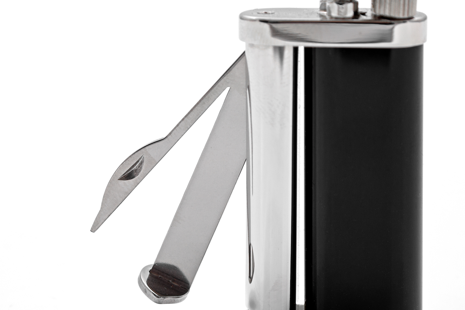 In der seitlichen Säule befindet sich ein Dorn sowie ein integrierter Stopfer. Die Fläche des Stopfers ist in der Ausgangsposition bedeckt – die Hosentasche bleibt sauber.