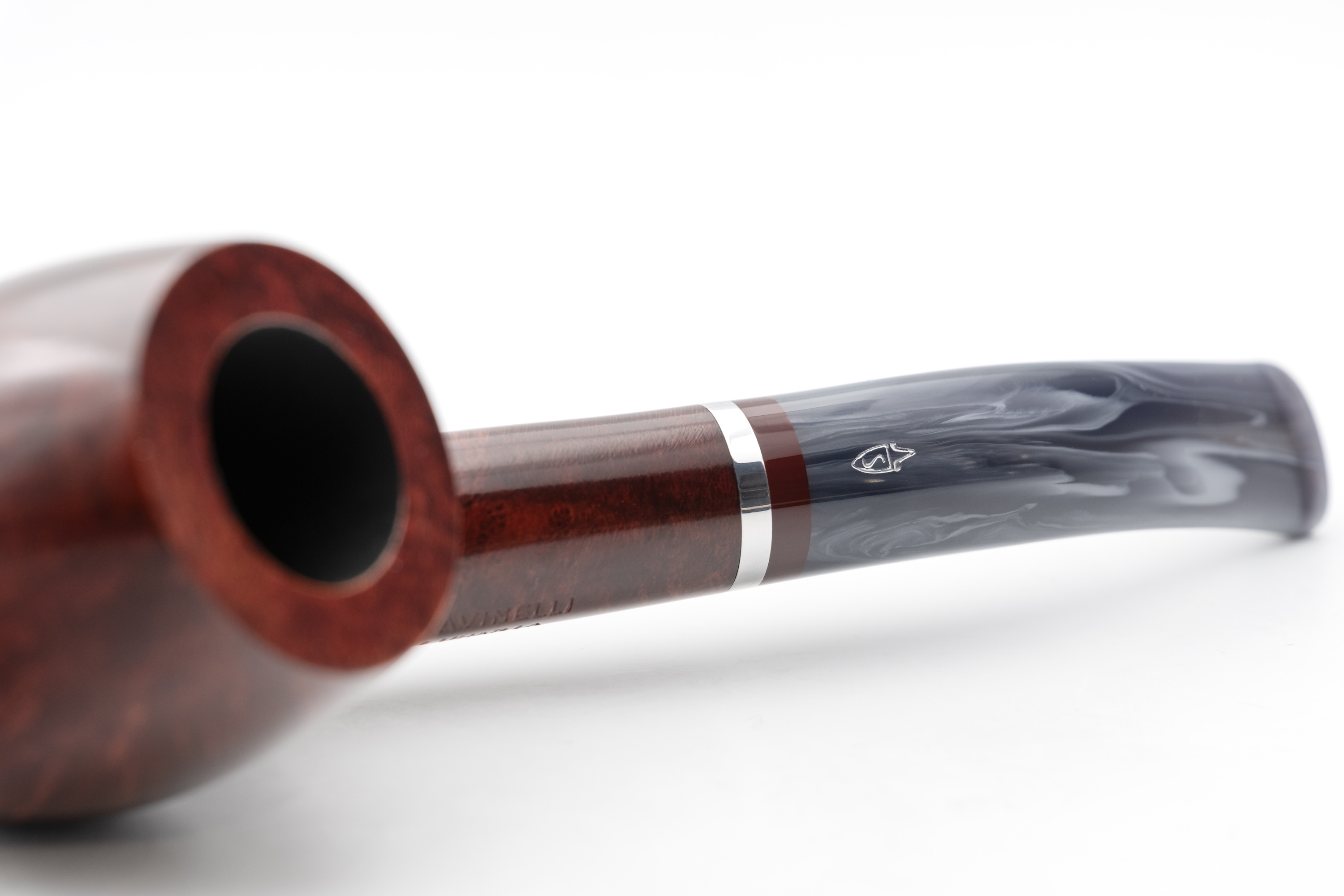 Für sich allein betrachtet strahlt es eine besondere Unnahbarkeit und Kühle aus, ein Eindruck, der durch den eingelassenen Metallring noch verstärkt wird. Im Zusammenspiel mit dem warmen Bordeauxton des Bruyerekopfes ergibt sich jedoch ein spannender Kontrast.