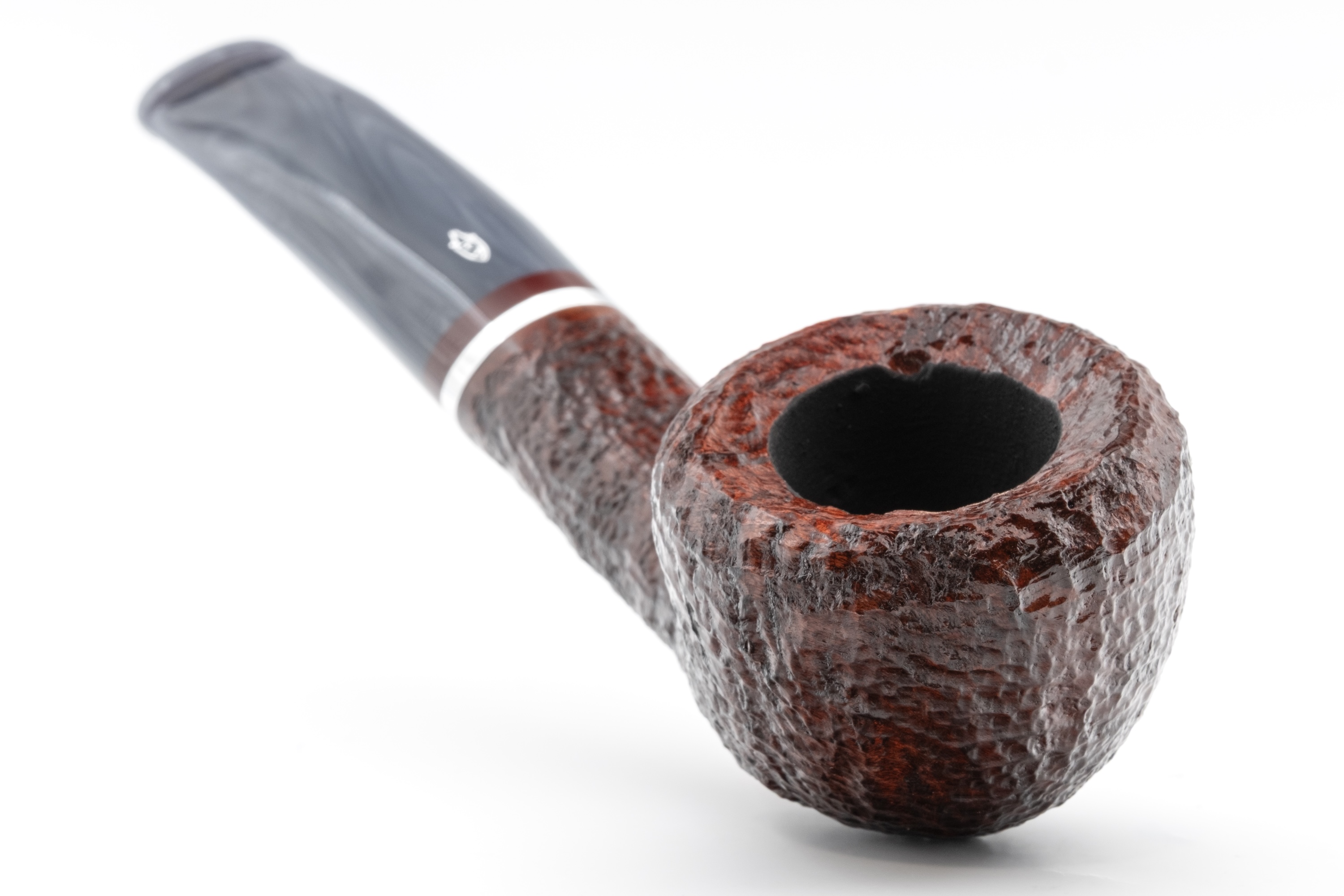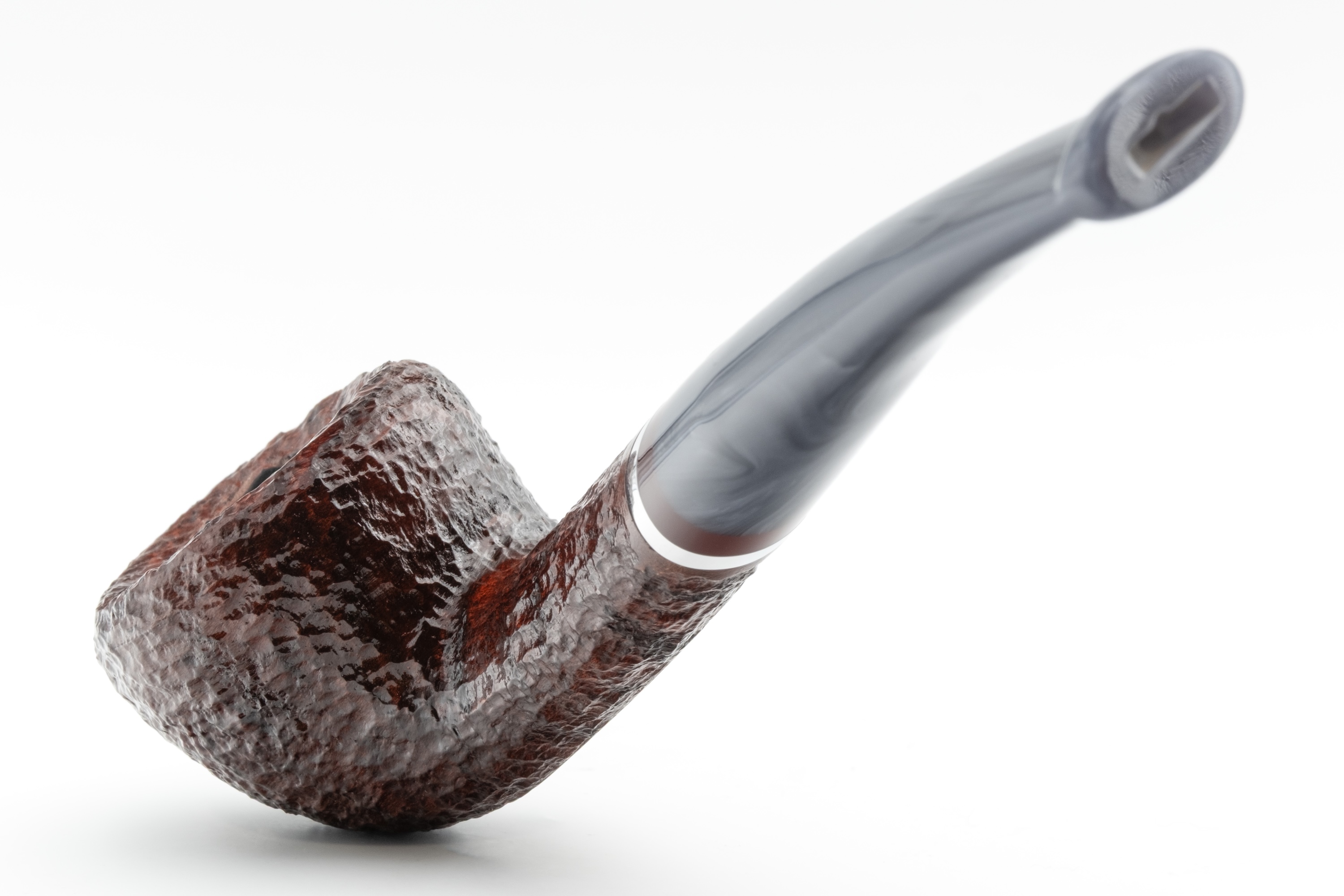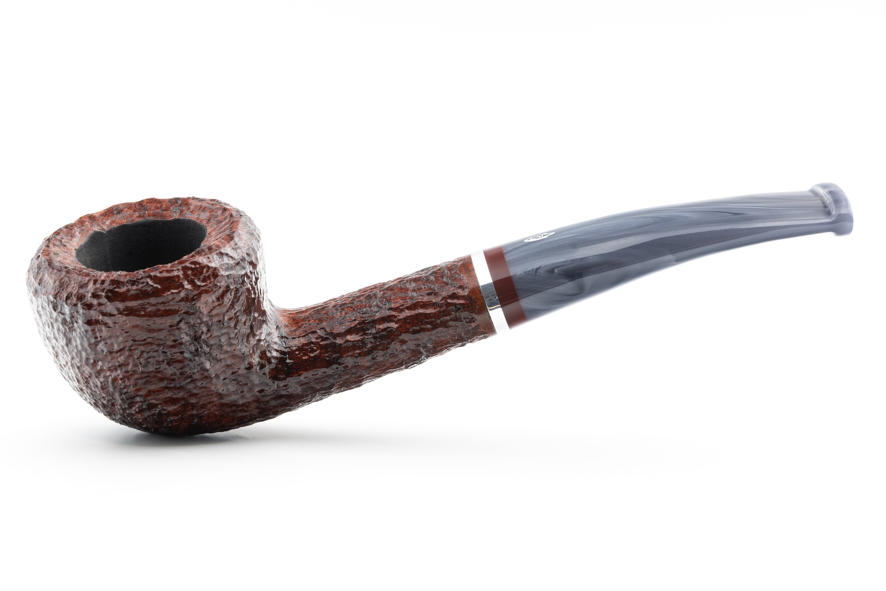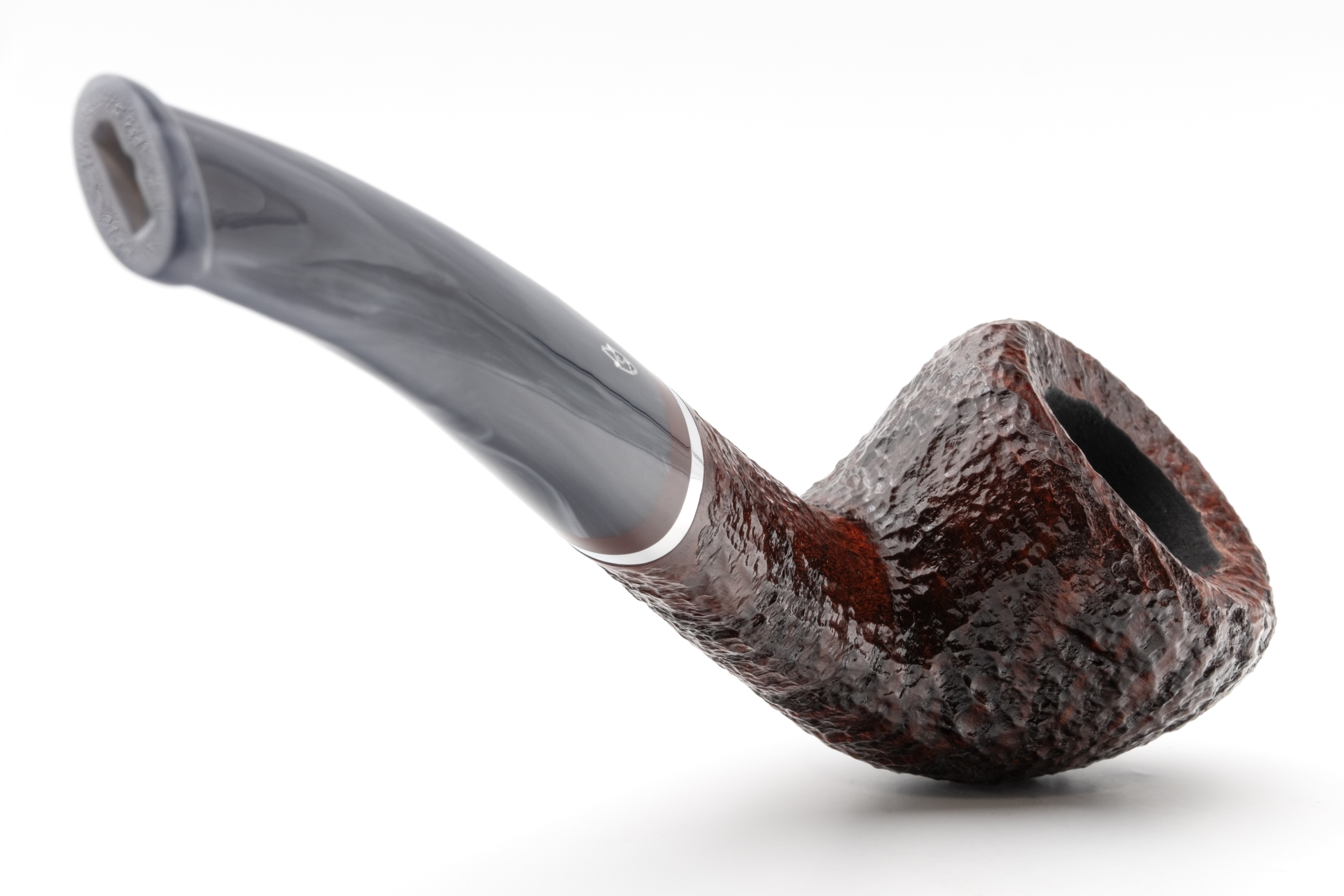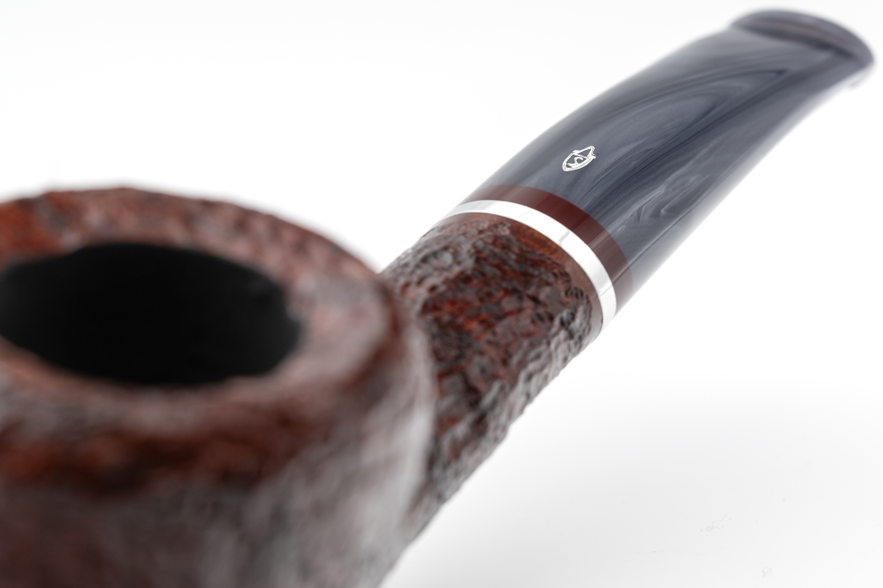 Für sich allein betrachtet strahlt es eine besondere Unnahbarkeit und Kühle aus, ein Eindruck, der durch den eingelassenen Metallring noch verstärkt wird. Im Zusammenspiel mit dem warmen Bordeauxton des Bruyerekopfes ergibt sich jedoch ein spannender Kontrast.