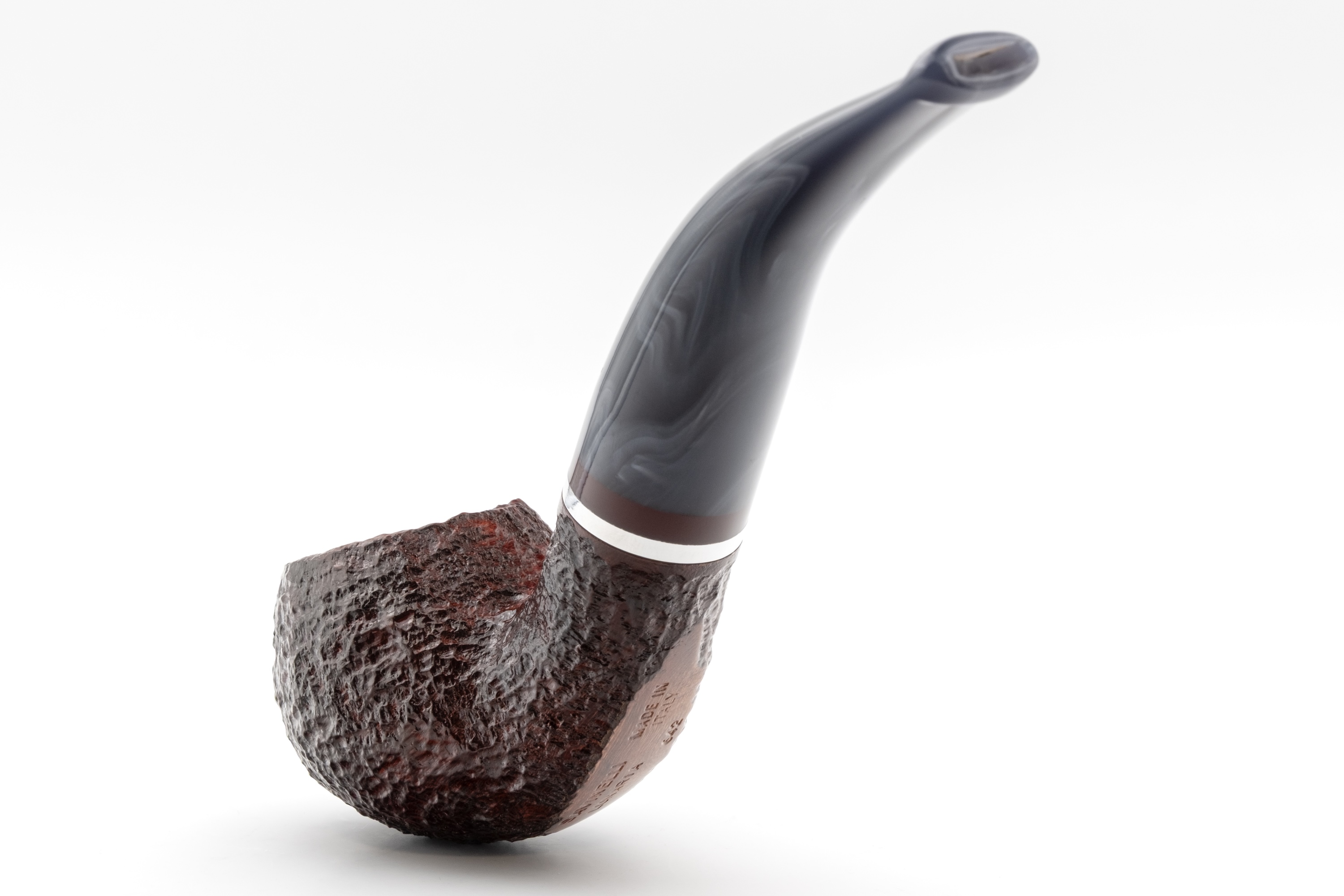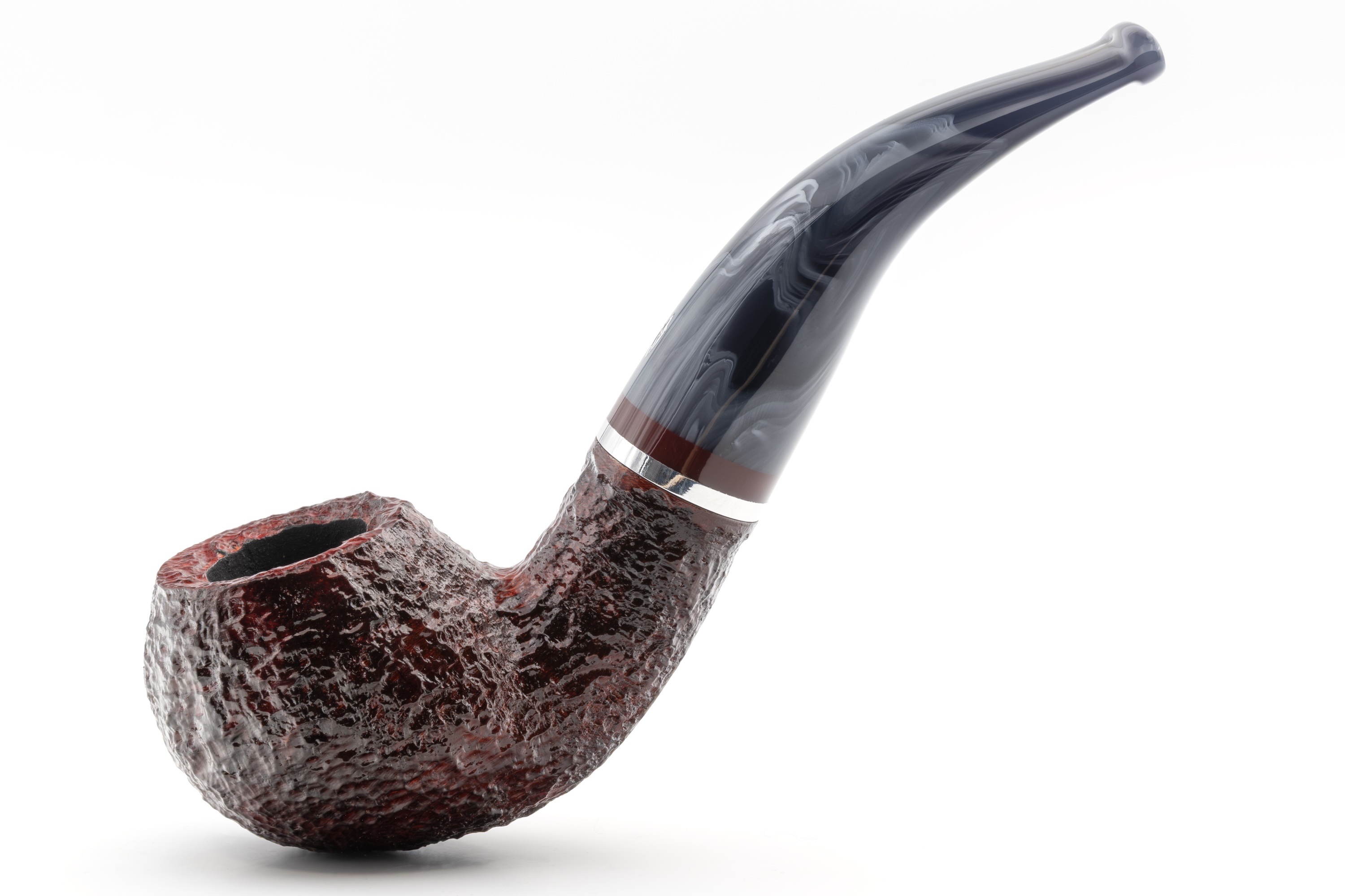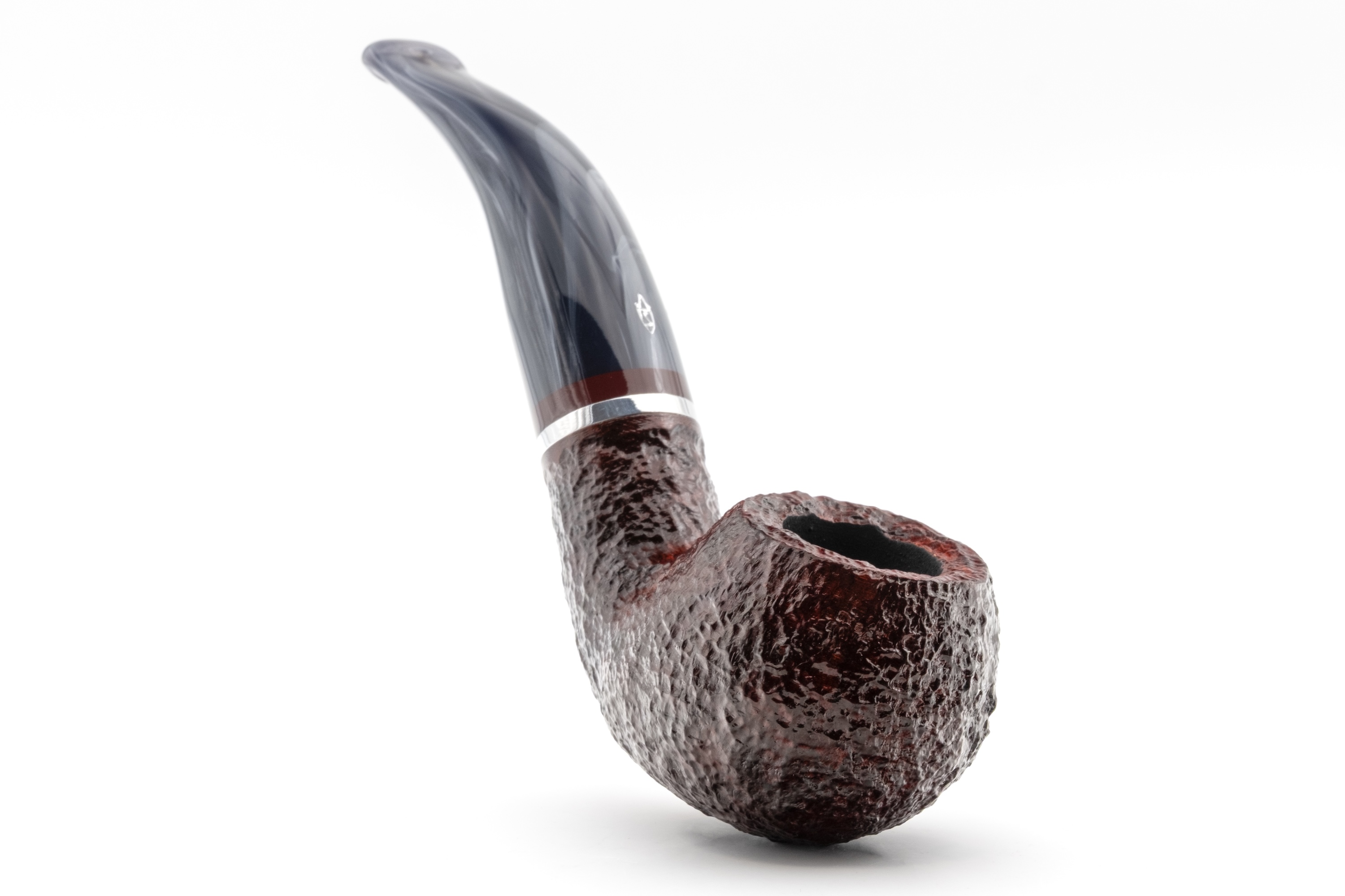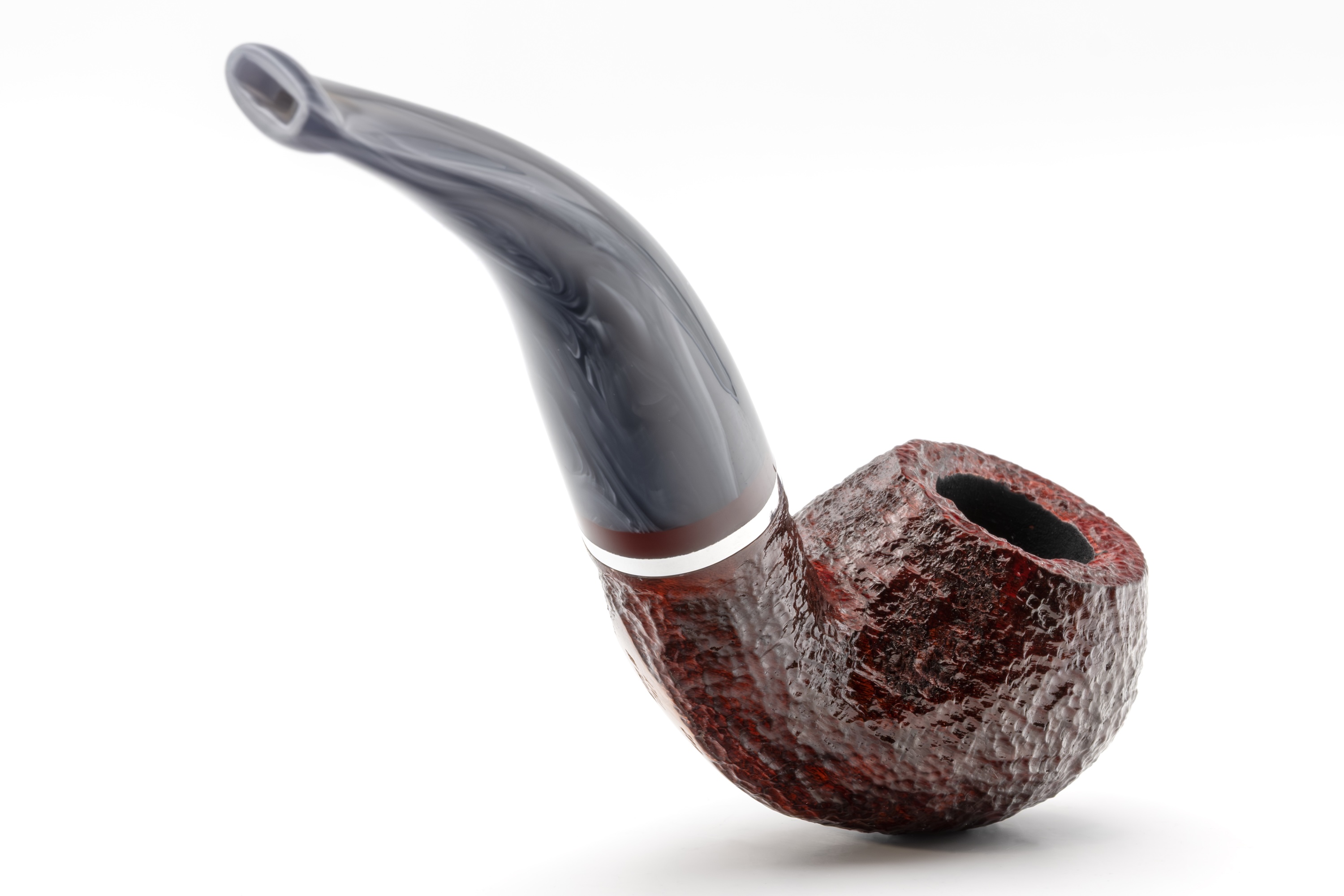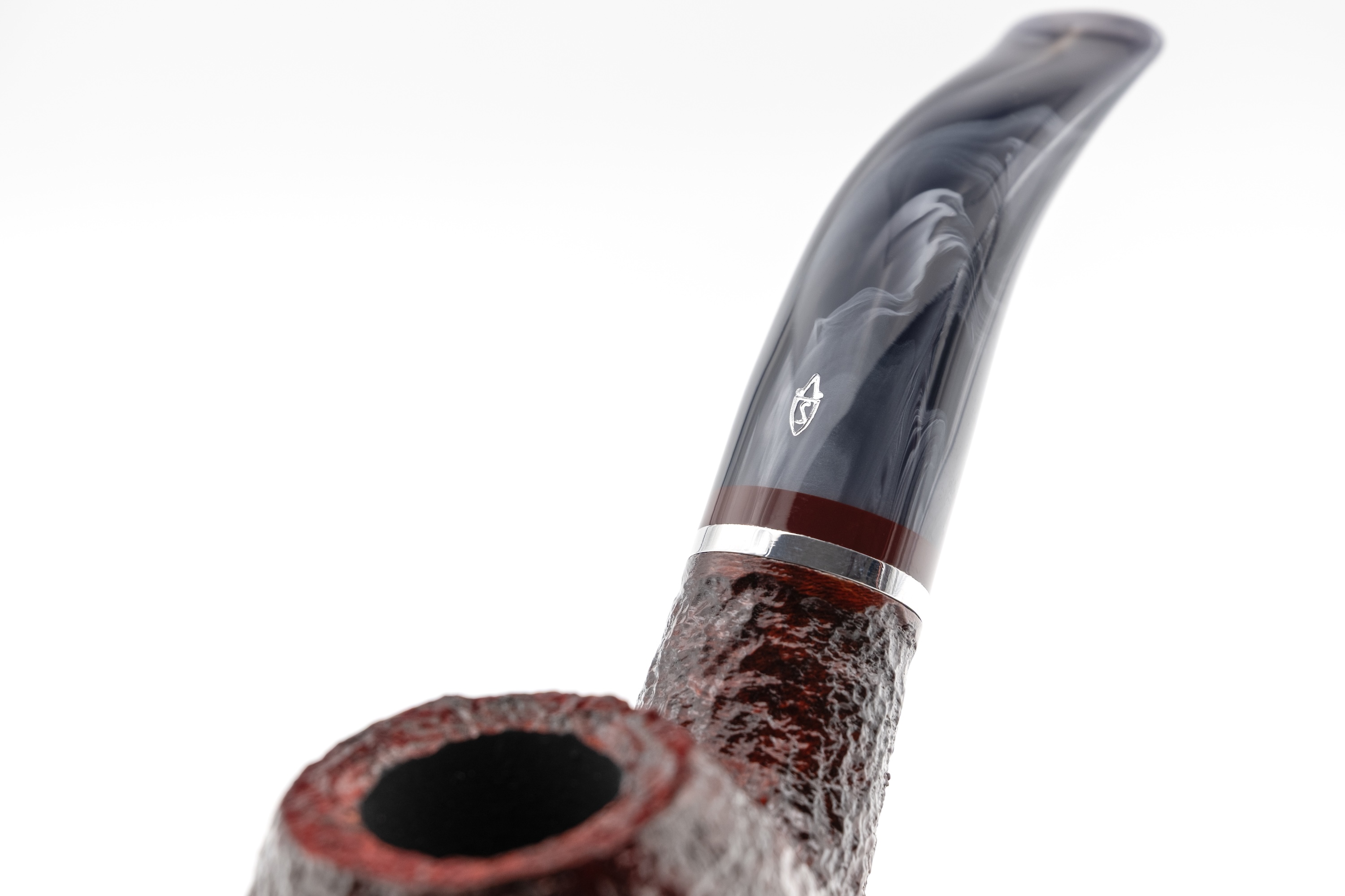Für sich allein betrachtet strahlt es eine besondere Unnahbarkeit und Kühle aus, ein Eindruck, der durch den eingelassenen Metallring noch verstärkt wird. Im Zusammenspiel mit dem warmen Bordeauxton des Bruyerekopfes ergibt sich jedoch ein spannender Kontrast.