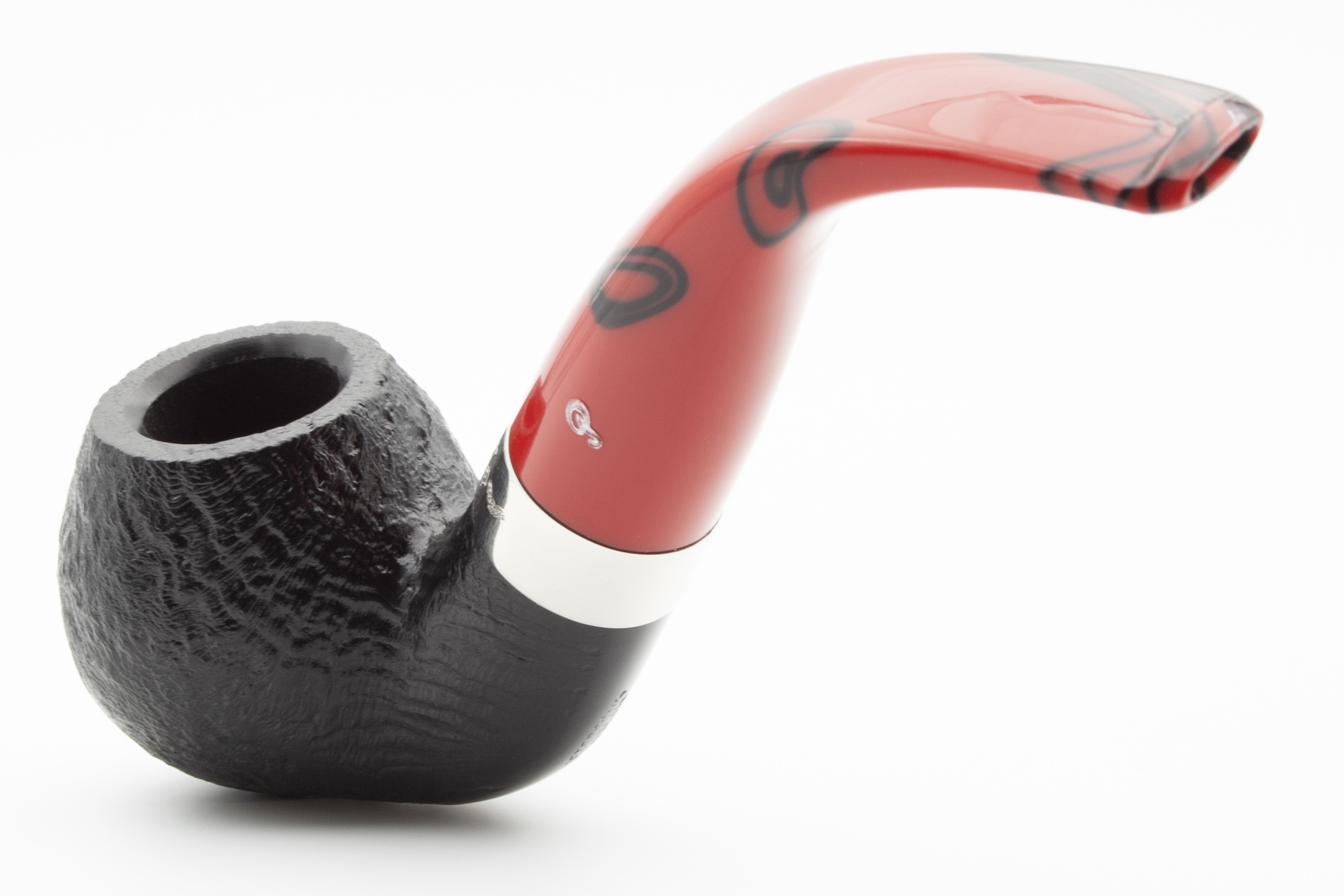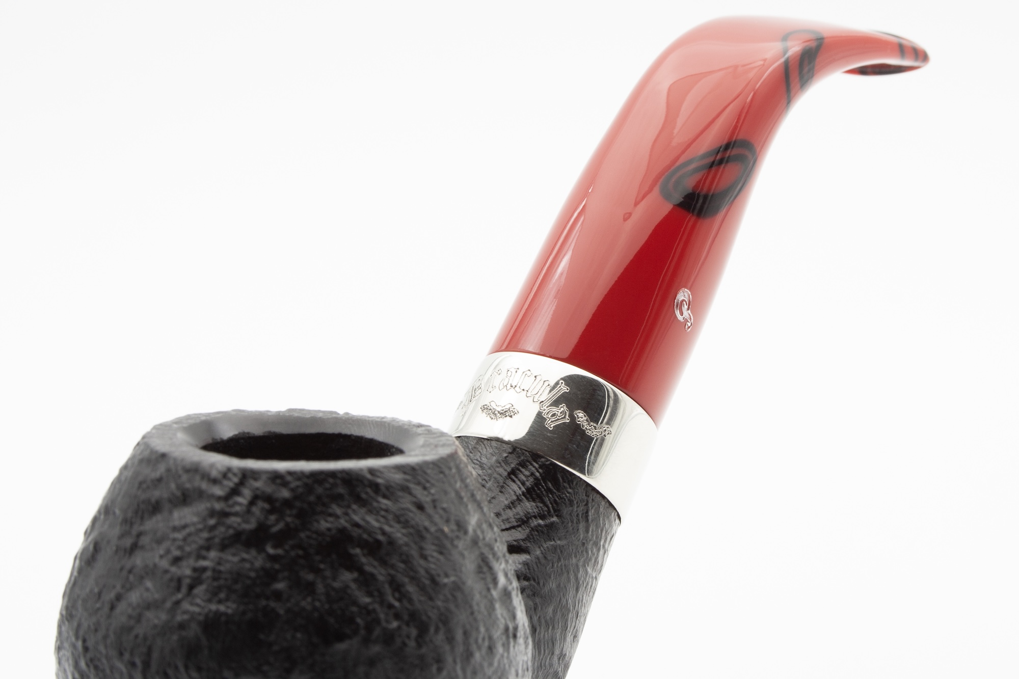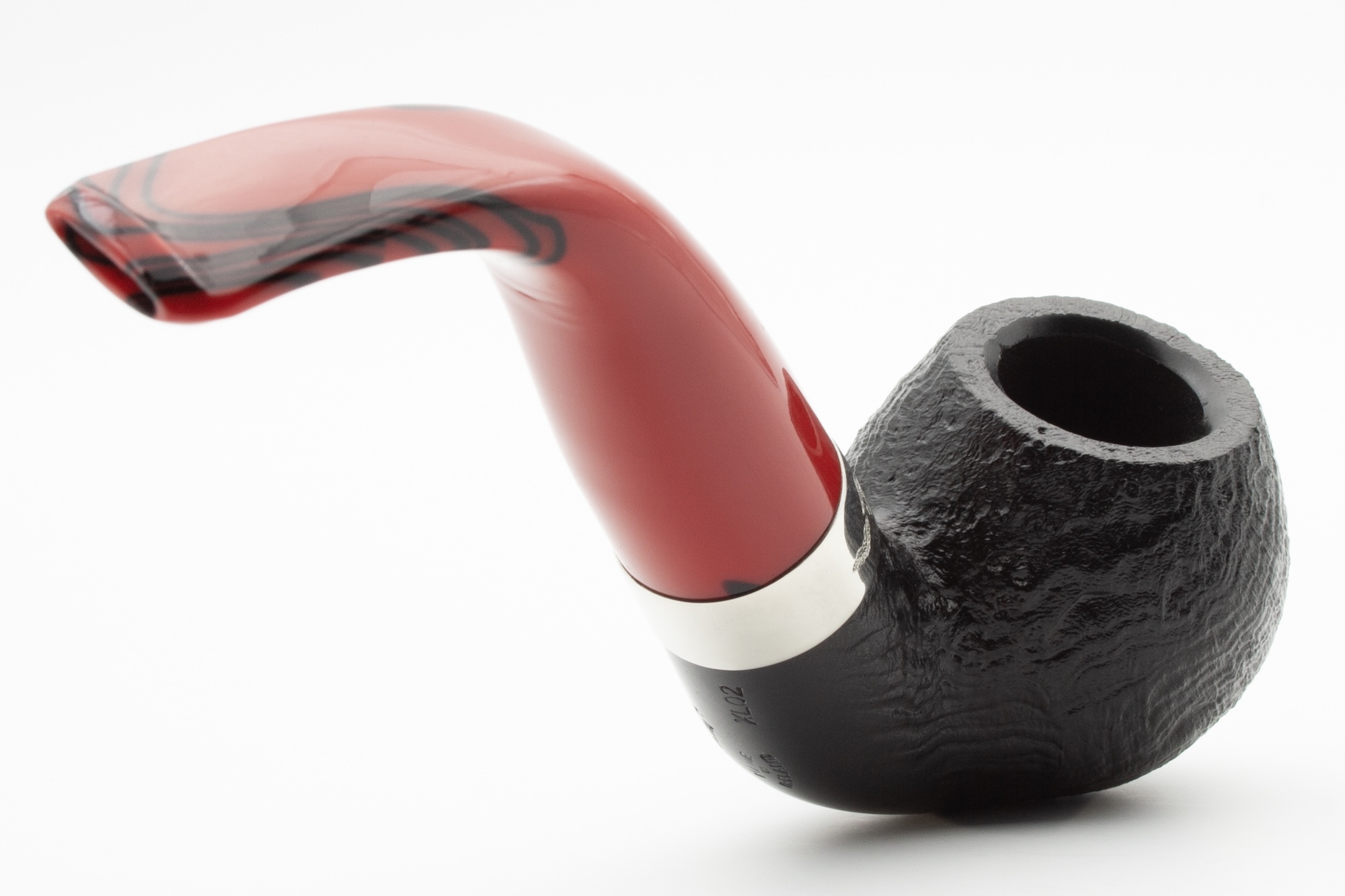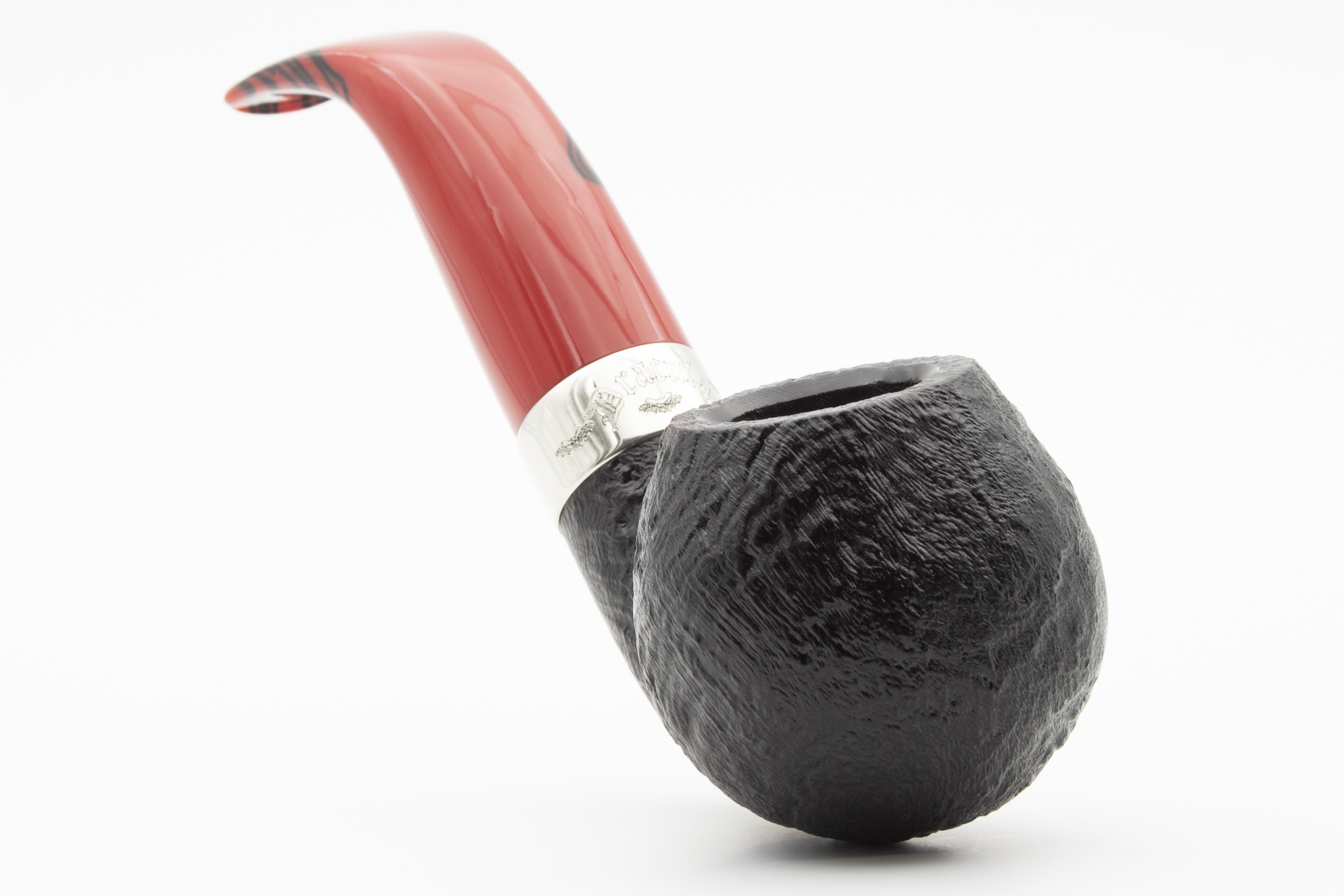 Originally created as a tribute to Bram Stoker, the series impresses with its strong contrast of deep black briar, sandblasted texture, and red acrylic stem. The chrome-plated brass band enhances the bold character of this pipe, ideal for enthusiasts of classic shapes.