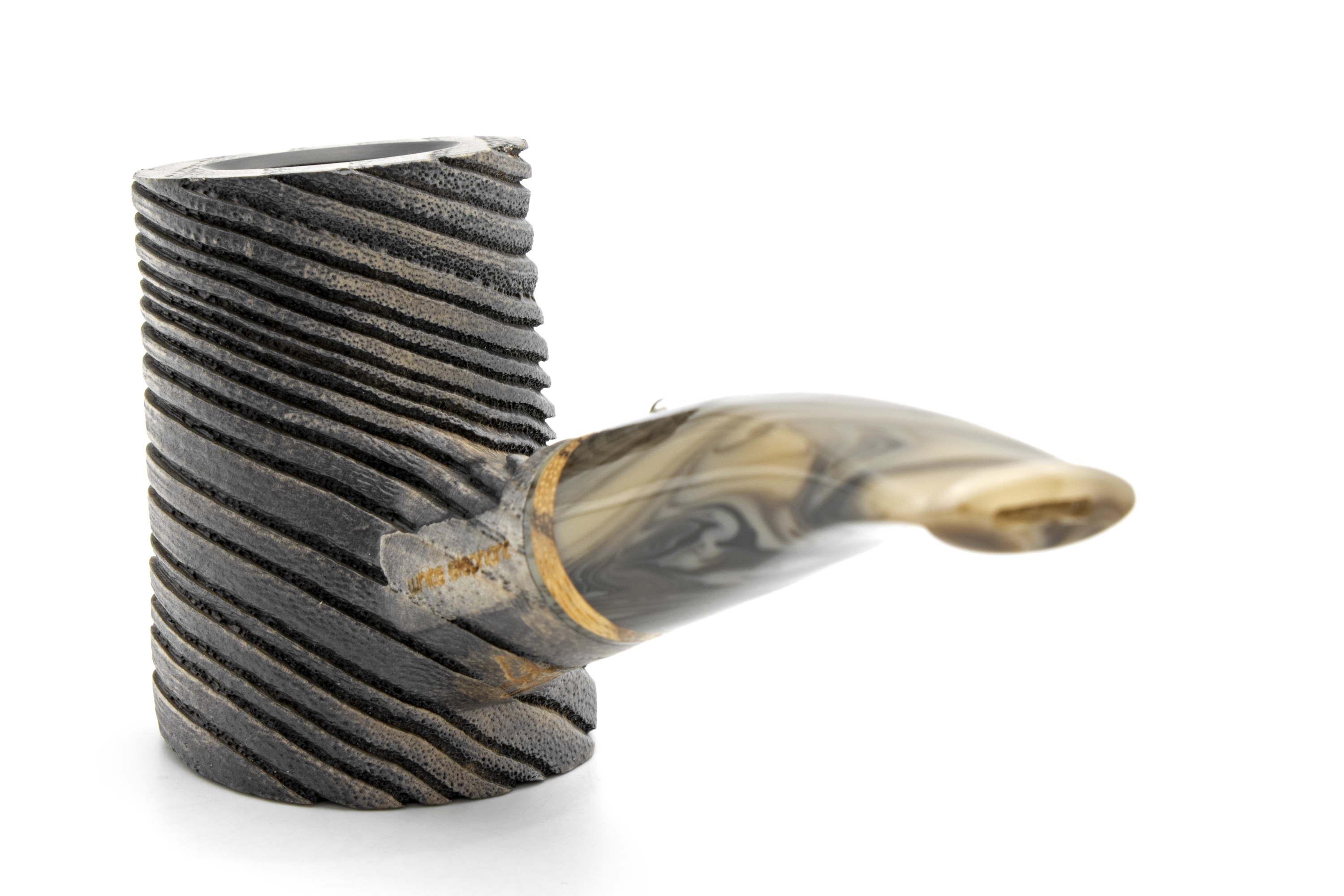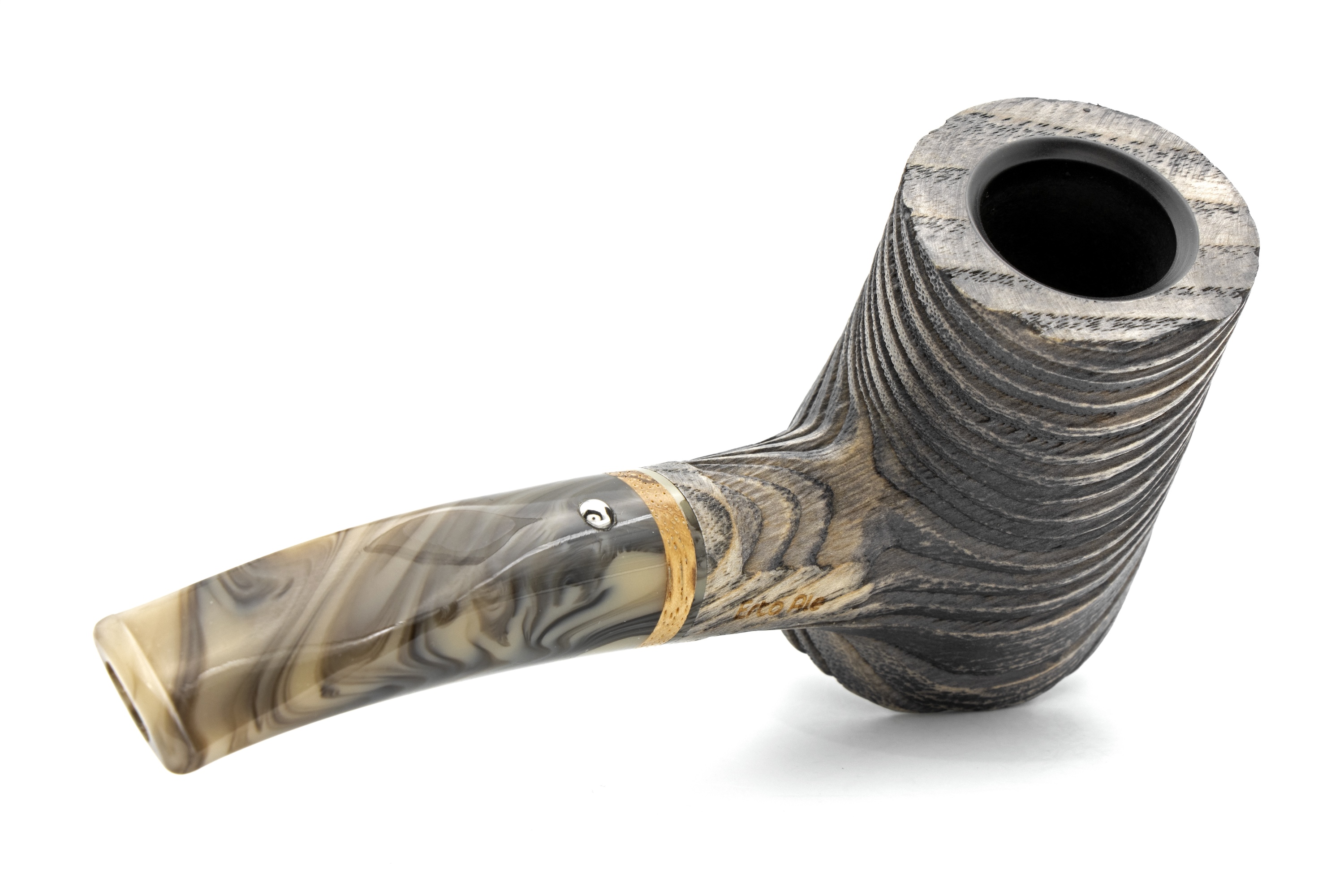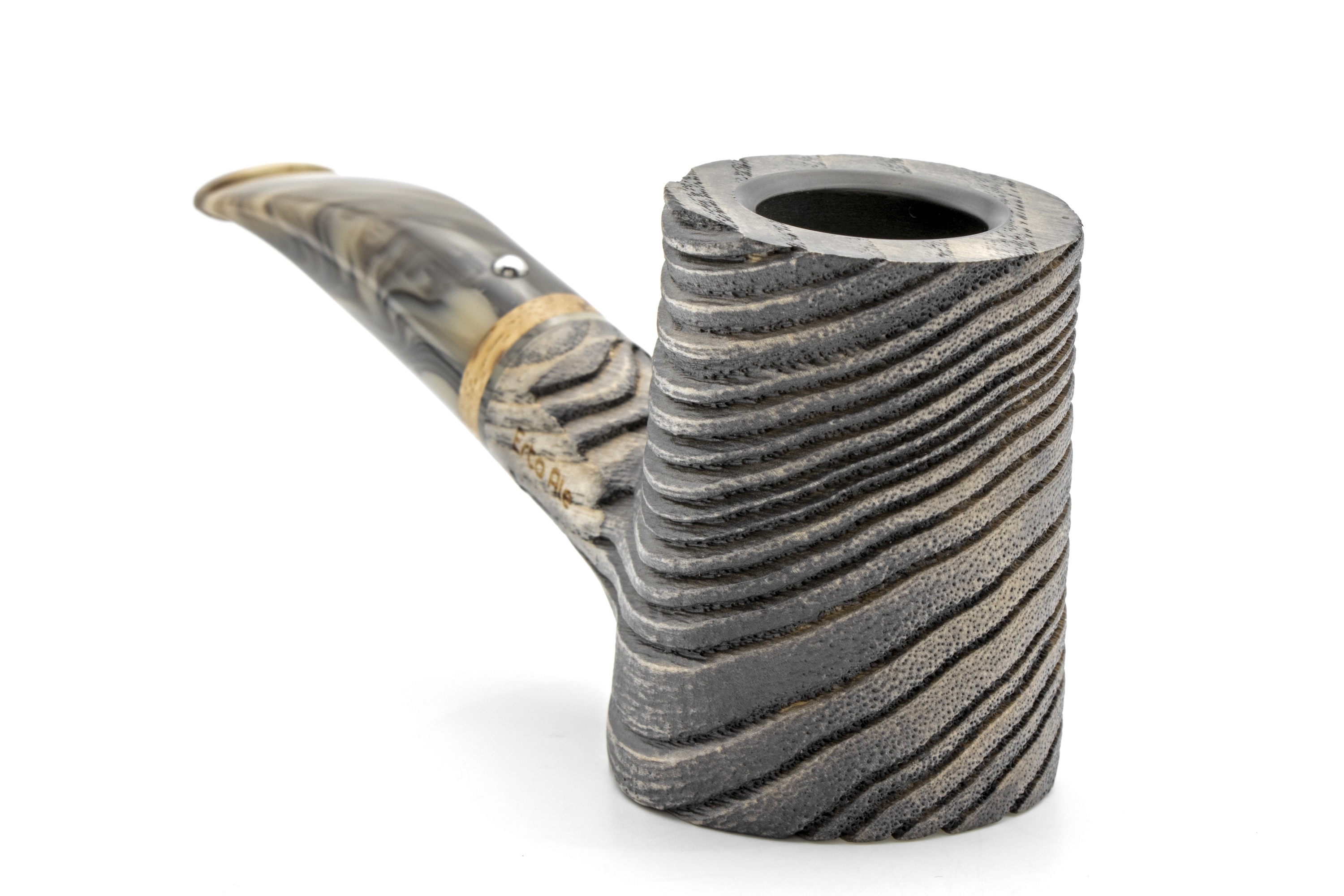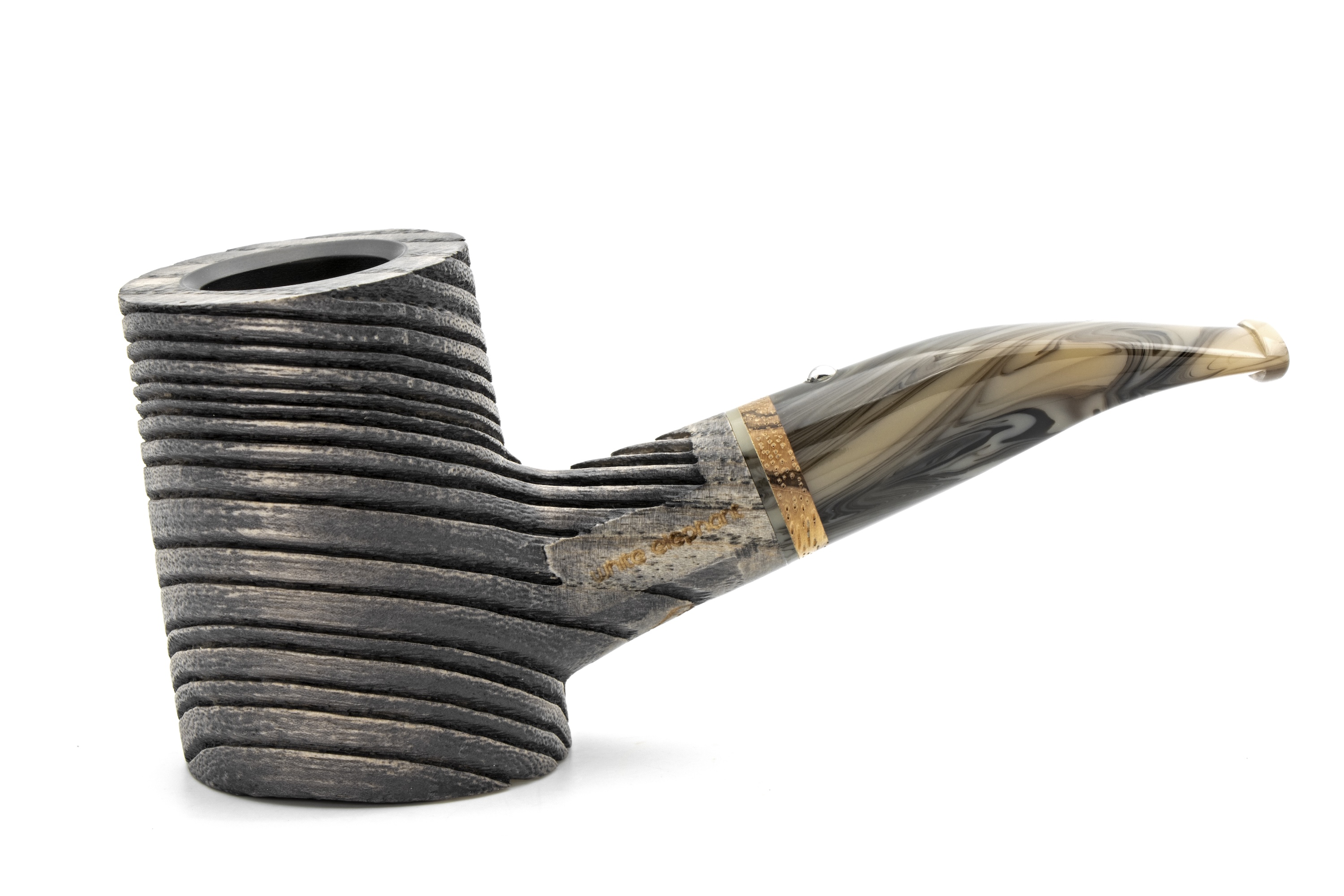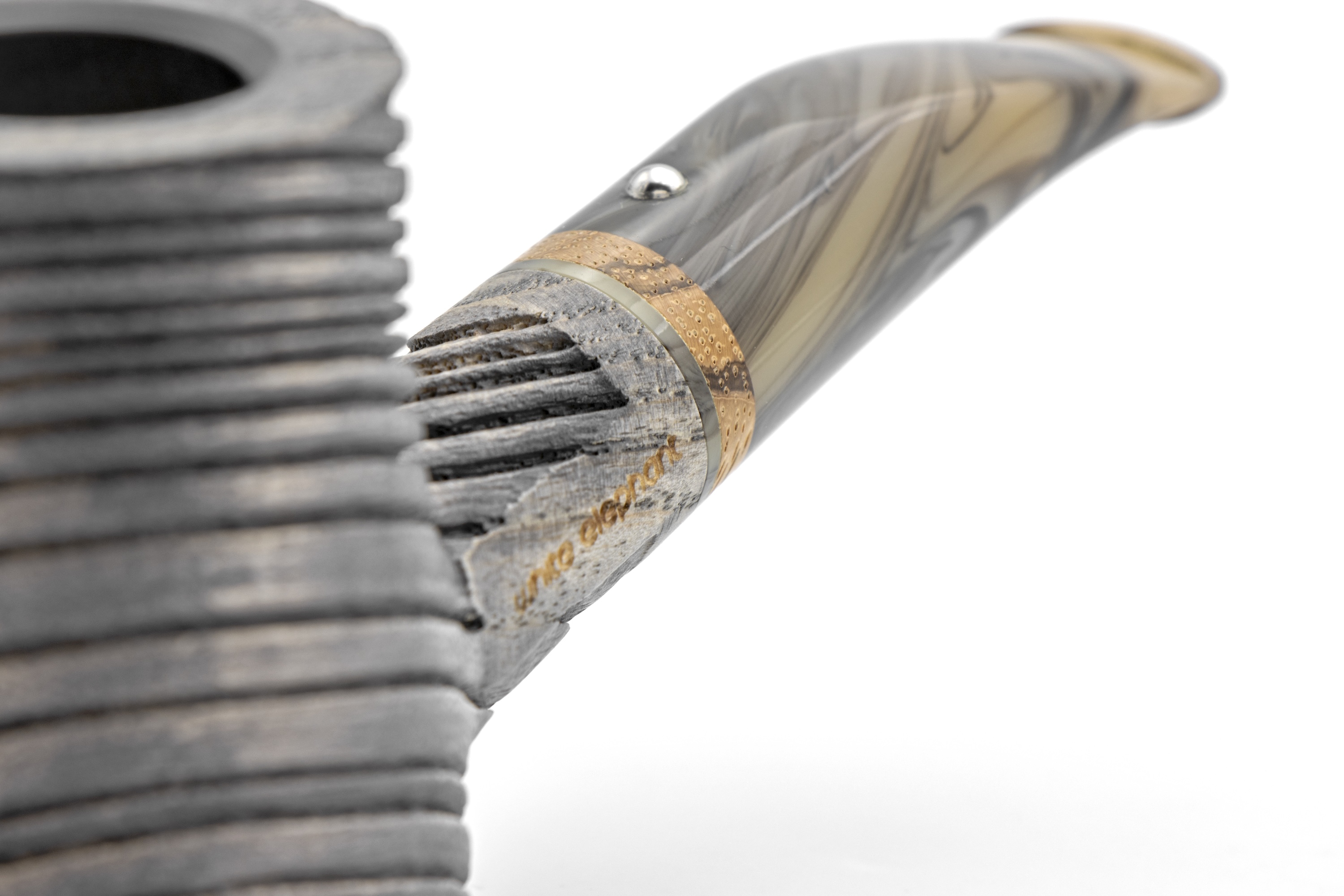 Now let us come to the essentials. The Erta Ale models are large yet compact. The bowl is made of South American ash, which, after intensive sandblasting, delivers a deep and impressive structure. This time, we have stained the wood ash grey. The mouthpiece has been coordinated accordingly. The hot acrylic compound is only lightly stirred during this process. Set into it, we have incorporated a genuine zebra ring, which emphasizes the wild natural look.